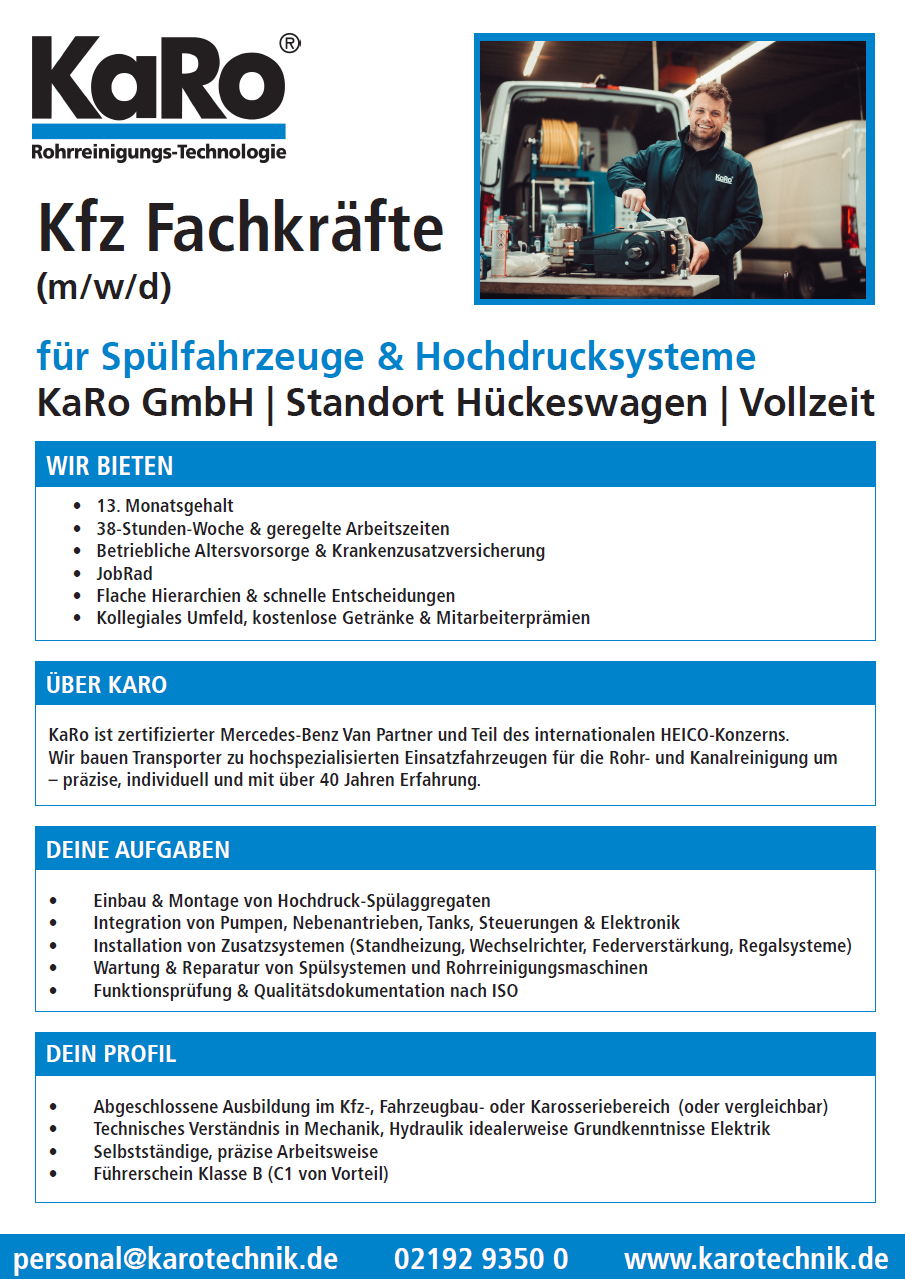 Du willst nicht nur arbeiten, sondern etwas bewegen? Bei KaRo Technik entwickelst du gemeinsam mit einem starken Team Lösungen für professionelle Rohrreinigung und Kanaltechnik – praxisnah, innovativ und mit echtem Mehrwert für unsere Kunden.
