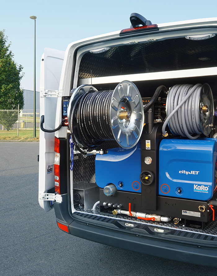 Es gehört zu den kompaktesten Hochdruck-Aggregaten seiner Klasse und ist perfekt konstruiert zum Einbau in den tiefgaragenfähigen Mercedes-Benz Vito. Aufgrund der platzsparenden Einbaumaße verbleibt im Fahrzeug viel Stauraum für den Transport von Ausrüstung und Werkzeugen. Die hydraulische Hochdruckhaspel schwenkt bis zu 180 Grad für optimale Arbeitsbedingungen.