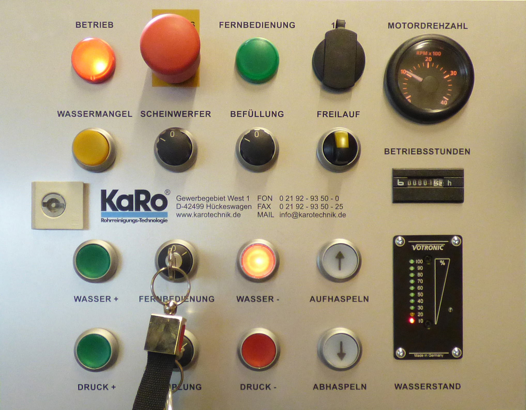 | Bedienungsstand | Regler für Hydraulik und Steuerventile für die angeschlossenen Haspeln, Drucktastenregler für stufenlose Motordrehzahl, Wasserregelung und Hydraulik (ausstattungsabhängig), sowie Anschlußdose für Kabel-Fernbedienung, übersichtlich und groß dimensioniertes Druckmanometer. |