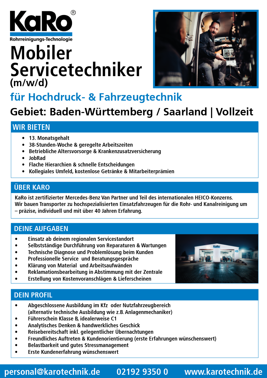 Du willst nicht nur arbeiten, sondern etwas bewegen? Bei KaRo Technik entwickelst du gemeinsam mit einem starken Team Lösungen für professionelle Rohrreinigung und Kanaltechnik – praxisnah, innovativ und mit echtem Mehrwert für unsere Kunden.